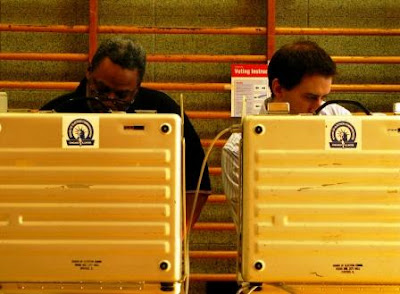A máquina que está ao lado da larga Charletta Tibbs tinha engolido o boletim de voto de Barack Obama e de Michelle Obama hora e meia antes de eu fazer foto (em baixo). "Um dia de sol tão bonito como este é óptimo para um novo começo", disse-me quando lhe perguntei sobre Obama, as eleições e o clima que o país vivia naquele momento.